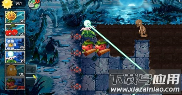 1、瀑布洞穴关需要先种植双生向日葵积攒500阳光,在第三波僵尸出现时用寒冰菇冻结瀑布;