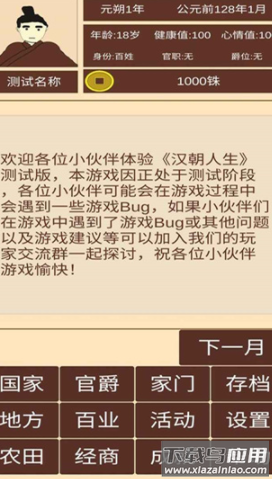 穿越千年时光,回到风云激荡的西汉王朝,在这款历史题材的文字模拟游戏中,你将亲历大汉帝国的兴衰荣辱。从一介布衣到权倾朝野,每一次抉择都将改写人生轨迹,农耕桑麻的田园生活,尔虞我诈的官场浮沉,金戈铁马的沙场征战,多重人生道路任你选择。游戏真实还原汉代社会风貌,通过细腻的文字描写让你沉浸式体验两千年前的生活百态,喜欢历史模拟的玩家快来下载体验。