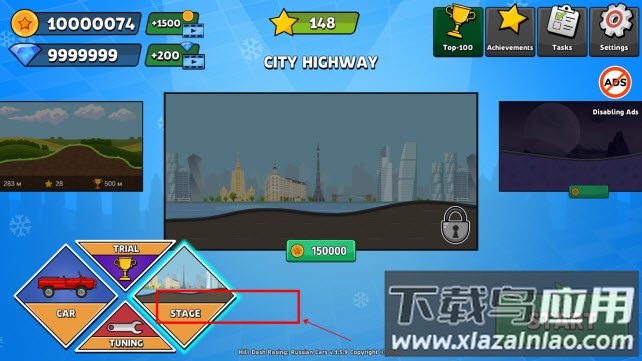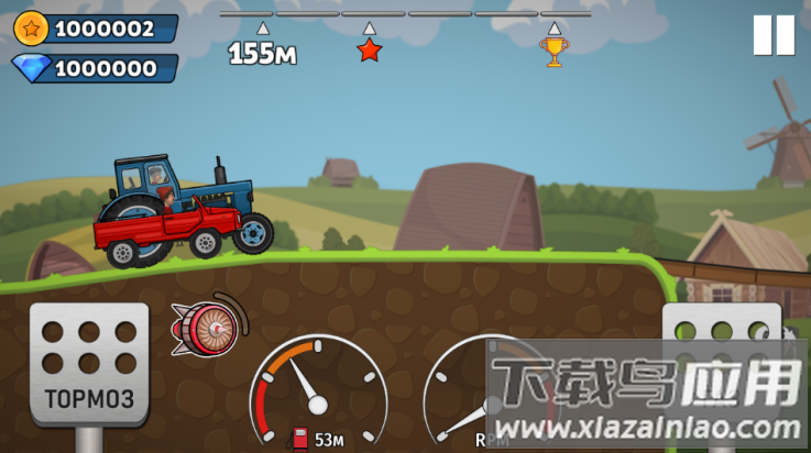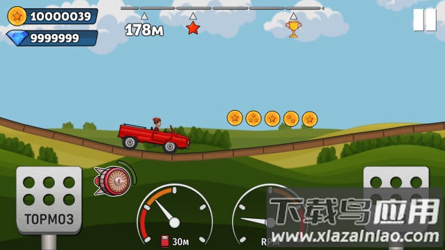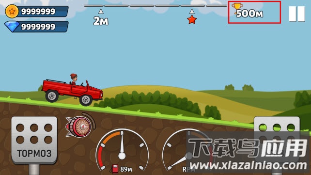2、界面顶部显示当前关卡目标距离,底部为油门和制动按键;