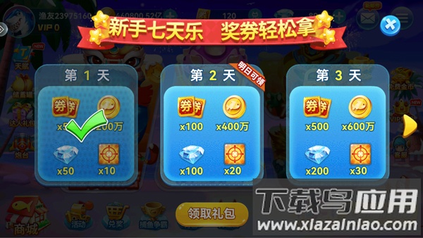 1、连续登录7天可领取史诗级渔网道具,捕获范围提升300%;