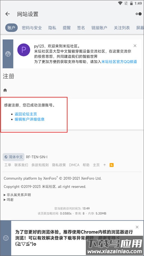 5、看到注册成功提示后即可使用新账号登录社区。