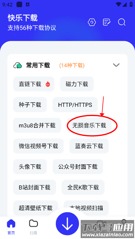 1、启动应用程序后,在主界面选择音乐下载专区;