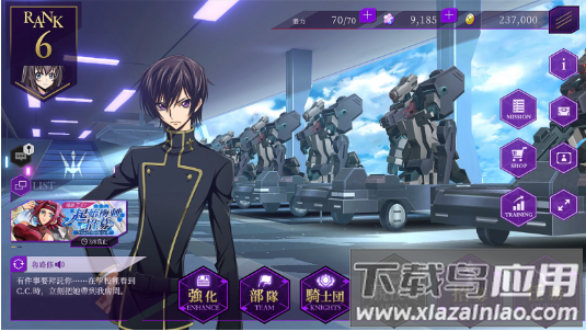 在充满权谋与抗争的11区,一场由少年鲁路修主导的复仇史诗即将在移动端重现。这款以经典动画为蓝本的角色扮演手游,完美继承了原作错综复杂的政治博弈与热血沸腾的机甲对决。玩家将化身鲁路修的得力伙伴,通过招募卡牌角色组建专属部队,在3D渲染的战场上运用Geass能力改写战局。游戏不仅复刻了动画中学生会日常与黑色骑士团起义等名场面,更追加了全新的失落篇章剧情,让玩家以第一视角参与战略部署。所有角色均采用Live2D技术呈现,战斗时Knightmare机体细节清晰可见,配合原作声优阵容的全语音演出,为粉丝带来沉浸式体验。感兴趣的玩家现在即可下载加入反抗阵营。