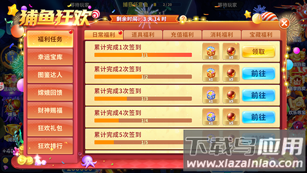 2、七日登陆:连续签到可获得传说级渔网道具,第七天必得黄金鱼叉;