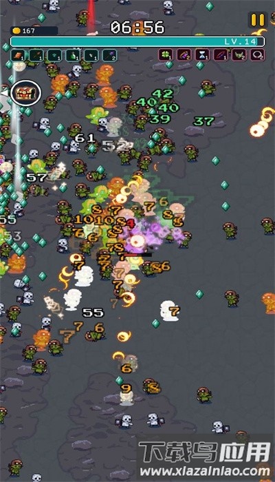 这是一款像素风格的生存手游,玩家将扮演不同职业的角色,骑乘骏马在僵尸与骷髅群中穿梭施法。通过自由组合技能与道具,收集金币与经验提升实力,最终迎战红衣骑士团。