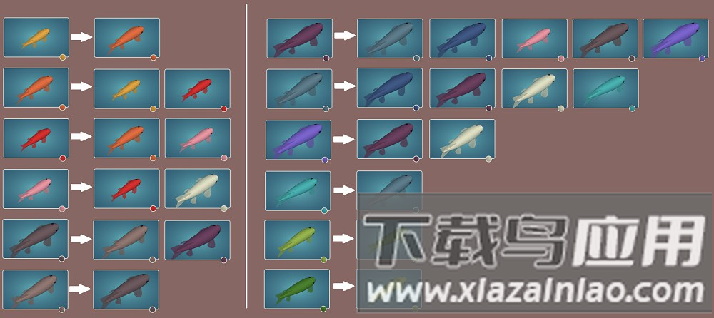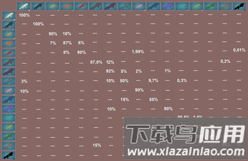 下表列出各颜色可能突变及概率。例如棕色突变为紫色的几率为12%,米色为0.2%,其余仍为棕色。这意味着需大量繁殖才能获得目标突变。例如繁殖两次黄色鱼,后代为9黄+1橙,即每次繁殖约得一条橙鱼。