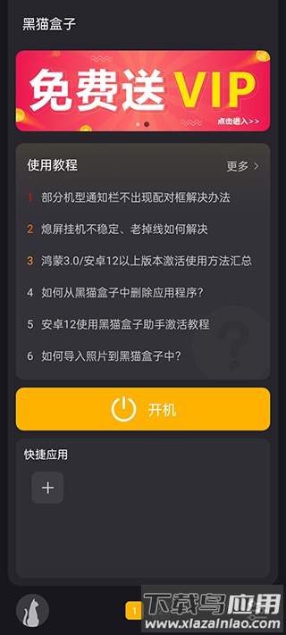 1、首先打开黑猫盒子app,点击开机按钮;