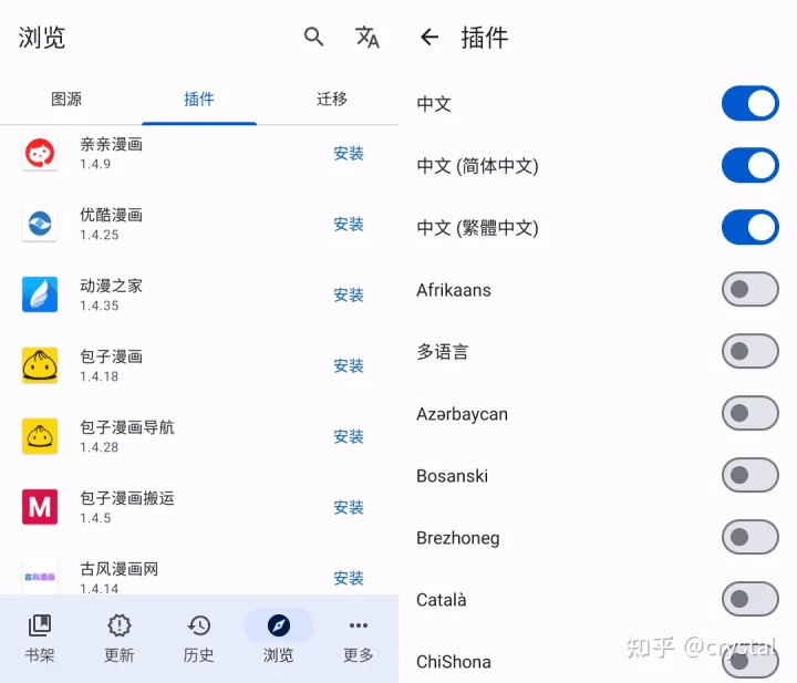 进入“浏览-插件”页,可筛选并安装中文漫画源;