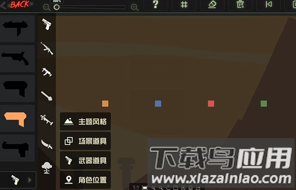 3. 进入编辑界面后,可通过下方菜单切换主题、场景、武器与角色选项;长按地图元素可拖动调整位置;