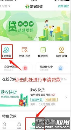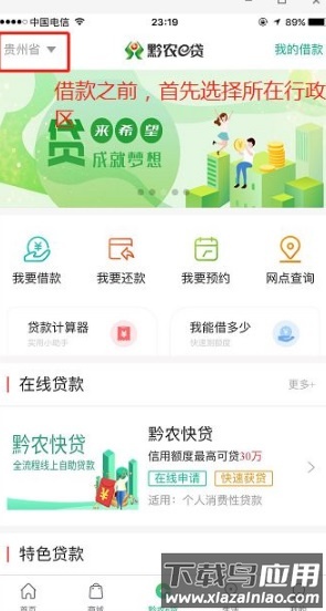 2. 登录成功后返回首页,点击“黔农e贷”,选择所在地区,再点“我要借款”;
