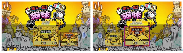 双人模式下“猫咪炮”变为“超猫咪炮”,需要两人配合操作,能量积累越多威力越大;战斗胜利后根据表现会获得合作称号。