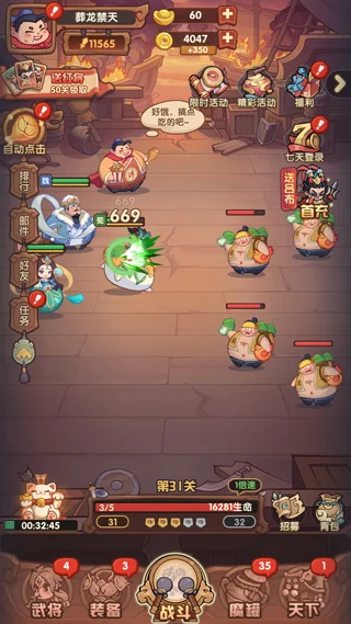 挂机即可收获资源,自动战斗解放操作时间;四大阵营武将各具特色,组合策略丰富多变;Q版造型配合幽默配音,营造轻松游戏氛围;包含多种挑战模式,满足不同玩法需求。