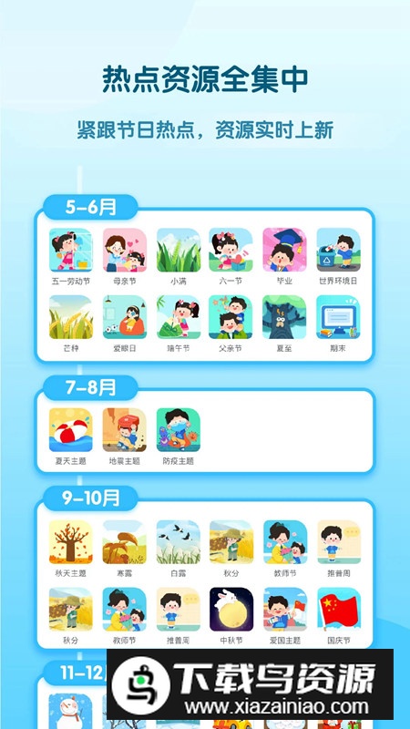 2、热点资源全集中;紧跟节日与教育热点,持续更新最新素材;