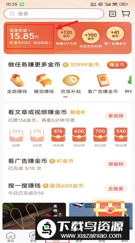 1、打开头条搜索极速版,点击底部“任务”标签,进入页面后选择顶部的“现金收益”入口;