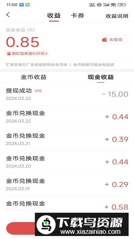 2、系统将展示你当前累计的金币数量与可提现的现金金额;