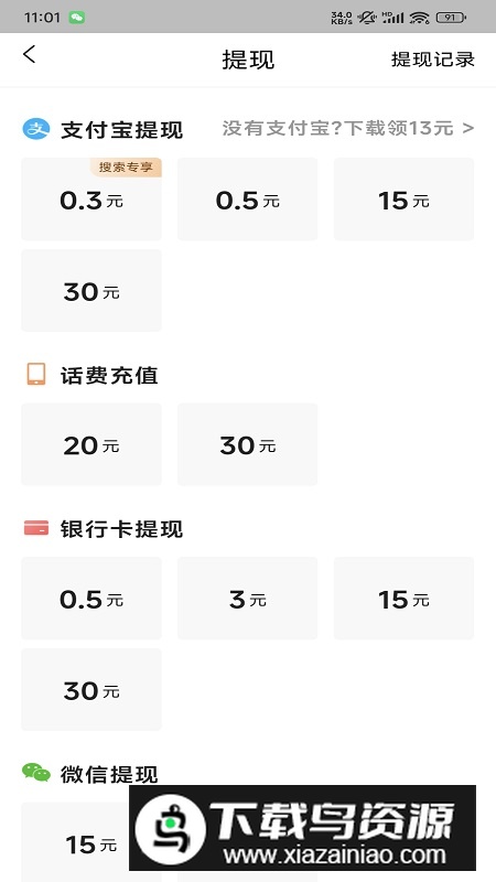 4、在提现页面中,支持支付宝、微信、银行卡等多种方式,也可选择话费充值;