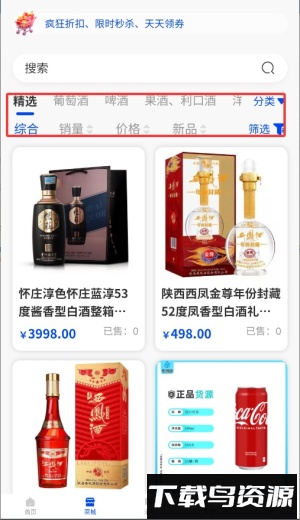 2、在首页导航栏选择"酒品商城"入口,浏览各类酒水产品和促销活动信息。