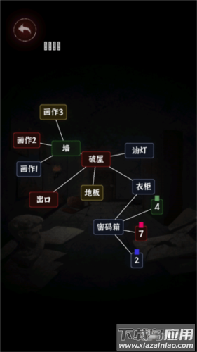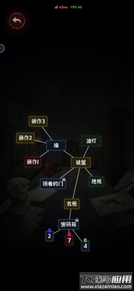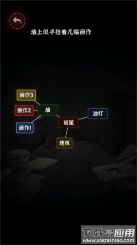 2、将“火柴”拖至“未点燃的油灯”,点亮后查看“墙”上三幅画作,再查看“破屋”中的“锁着的门”和“衣柜”,打开“衣柜”获得“密码箱”;