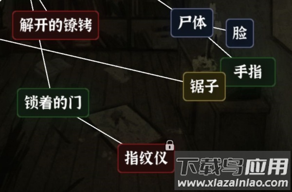 7、检查箱内“尸体”的“脸”与“手”,发现“锁着的门”为指纹锁,使用“锯子”锯下“手指”,用“手指”解锁门锁即可逃脱。
