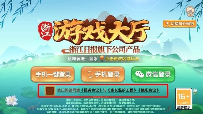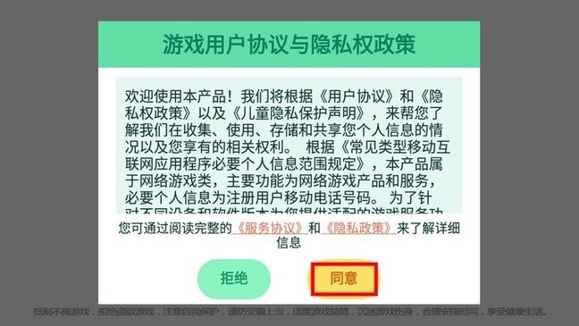 4、勾选确认已阅读并同意服务协议、家长监护工程及隐私协议,选择登录方式后即可进入游戏。
