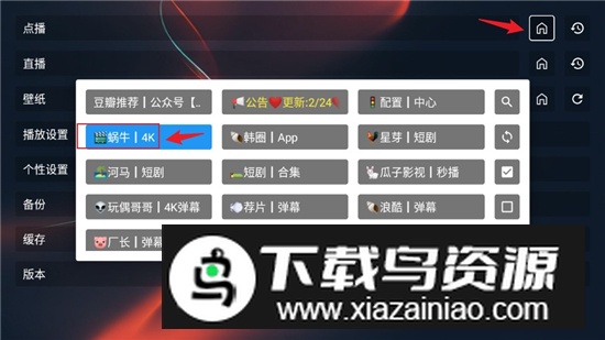 4、找到点播选项后方的小房子图标,点击后从下方列出的视频源中选择任意一个即可;