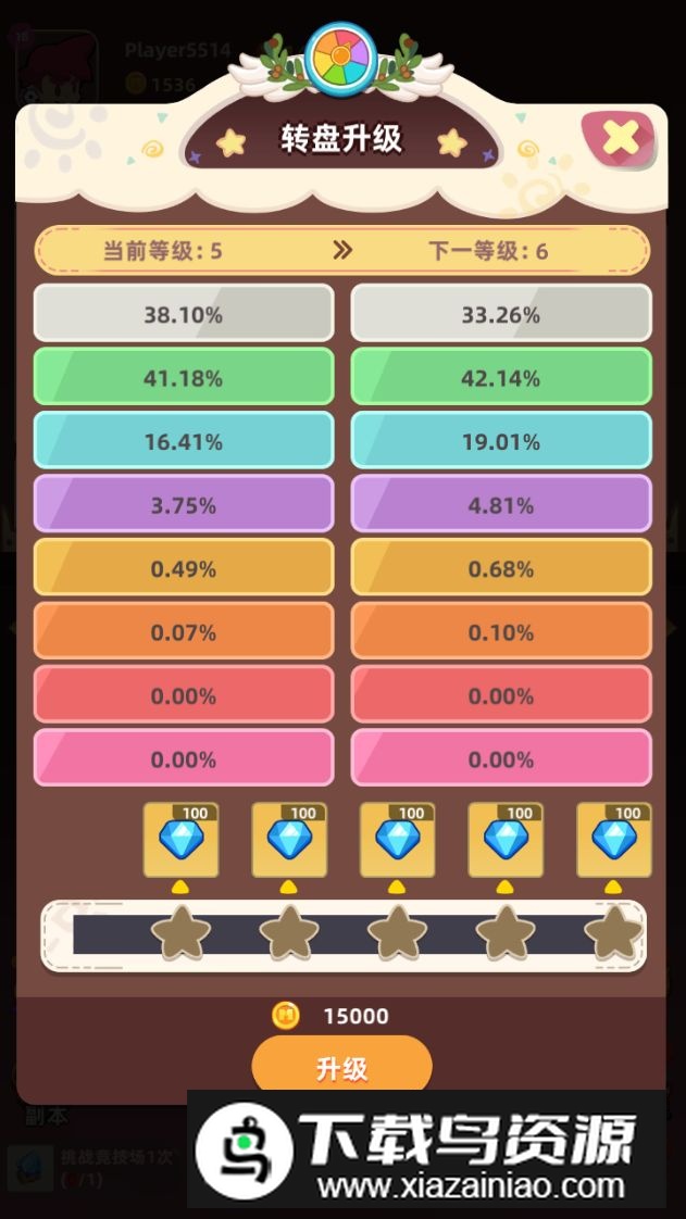 3. 轮盘升级条件逐渐严格,初始仅需一颗星星,后续需要更多星星,每次金币升级点亮一颗,集满即可完成当前等级提升;