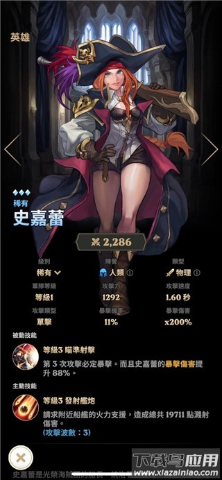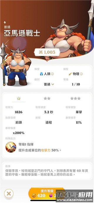 亚马逊战士:高攻慢速单位,擅长单体输出;主要价值在于特殊能力,可进一步提升高阶单位攻击力。