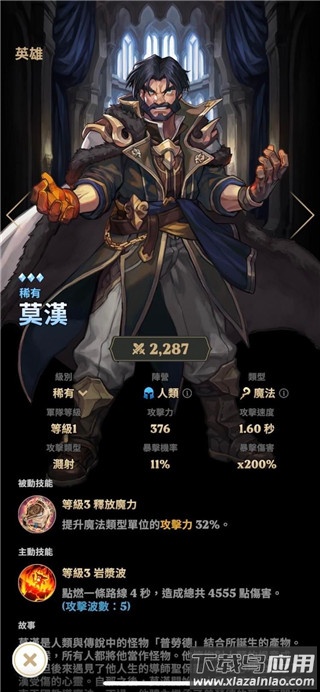 莫汉:外表愤怒的大叔,被动技能可提升魔法单位伤害,适合搭配法师类单位;英雄自身擅长清理小怪,最好能配合圣骑士等高单体伤害单位形成互补。