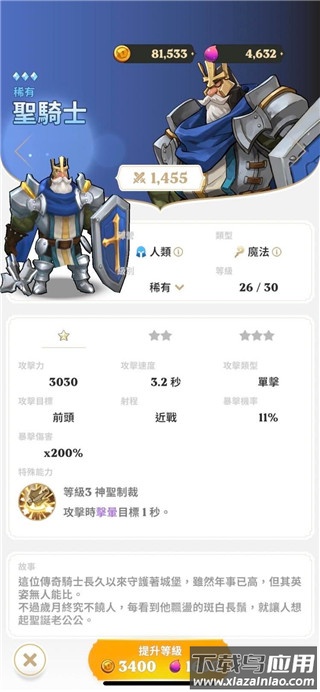 圣骑士:单体伤害极高的单位,初始攻速较慢,升级后攻速提升;若升至三级几乎所向披靡(除大量小怪外);特殊能力晕眩对数量少或移速慢的怪物效果显著。