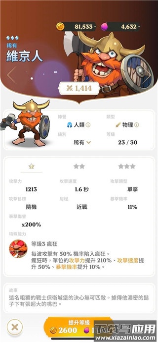 维京人:表现不稳定的单位,特殊能力为每回合概率进入狂暴状态,大幅提升输出;单体伤害高、攻速快,适合应对少量敌人;缺点是攻击目标随机,未狂暴时强度一般。