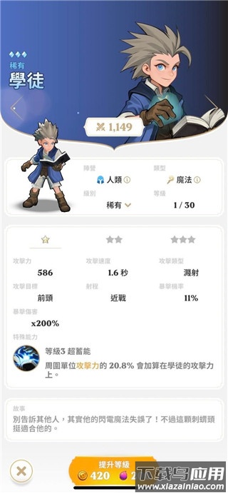 学徒:看似新手实则强力的法师,特殊能力可吸收相邻单位20%伤害转为自身输出,伤害带溅射且攻速快;若旁边放置三星圣骑士等高攻单位,将发挥巨大威力。