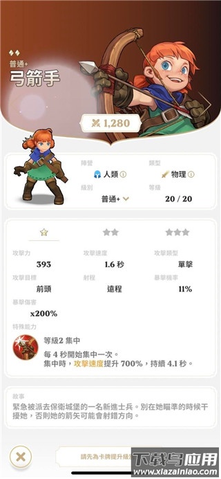 弓箭手:非常可爱的远程单位,射程远、攻速快;升至三级后成为万金油角色,高攻击力对单体有效,快攻速也能清理小怪。