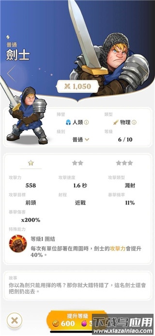剑士:外表普通但实力不俗,攻速快且带溅射伤害;相邻放置两个单位可提升其80%攻击力,前期获得二星剑士能稳定过渡。