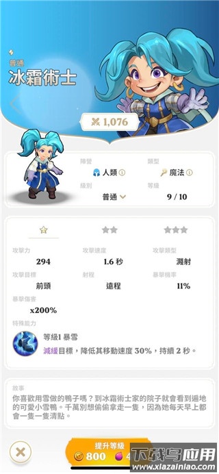 冰霜术士:可爱的冰法单位,伤害一般但缓速效果突出;三级缓速达60%,大幅延长输出时间;溅射攻击在高级时清小怪也有效,升级提升攻速。