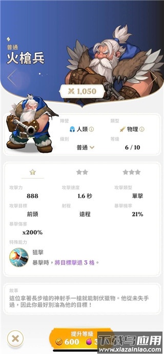 火枪兵:矮人火枪手,伤害高、射程远,升级加攻速;是处理精英怪与首领的可靠选择,特殊技能击退可阻滞慢速敌人前进。