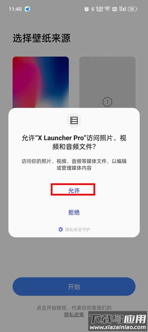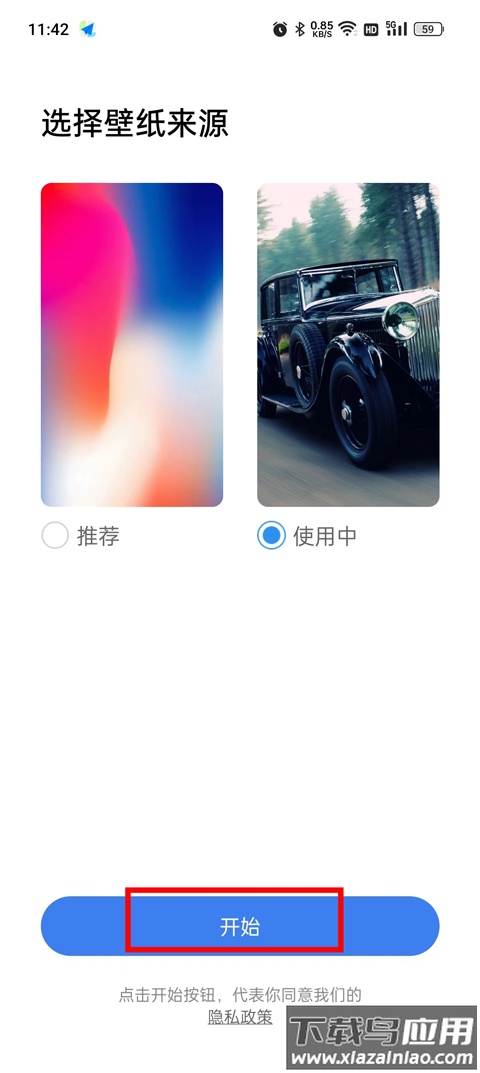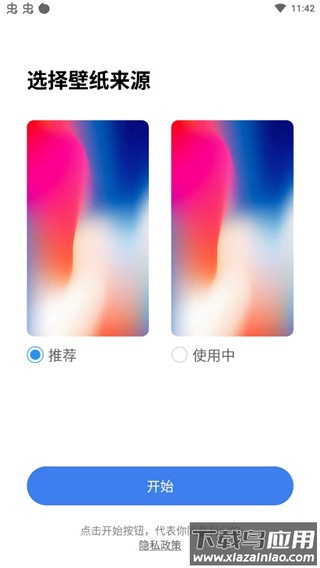 2、权限设置完成后,选择壁纸来源,推荐选用系统推荐的选项,点击底部开始按钮进入主界面;
