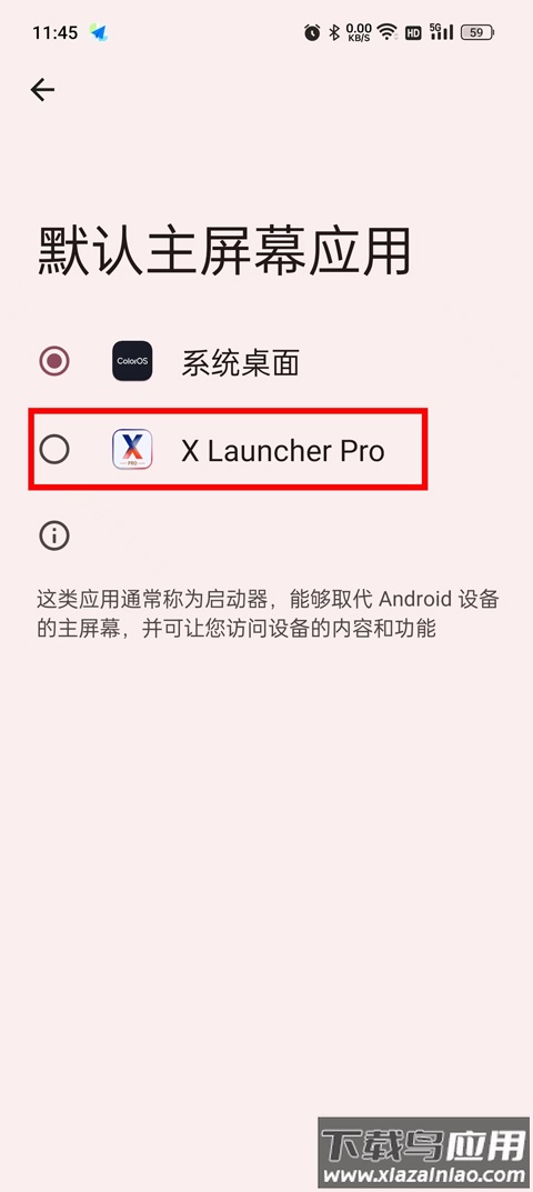 6、系统将跳转至默认主屏幕应用选择页面,选取x launcher pro选项,确认后即可完成默认桌面设置。