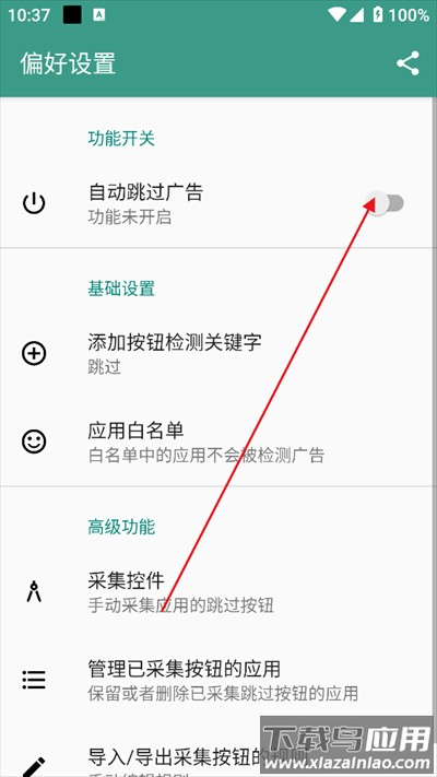 6、在设置中开启自动跳过广告功能,也可以自定义添加按钮关键词,实现更精准的广告跳过。