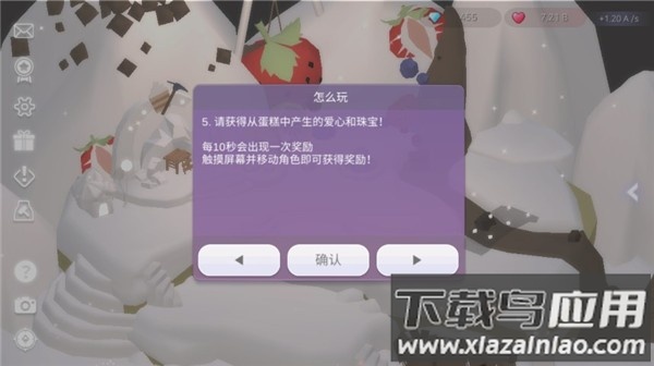 5、收集爱心与珠宝奖励;蛋糕每10秒会产生一次奖励,通过触摸屏幕移动角色即可获取。