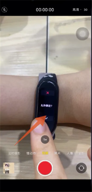 5、应用开始搜索设备,将手环靠近手机,当手环屏幕显示绑定确认提示时,点击勾号同意绑定。
