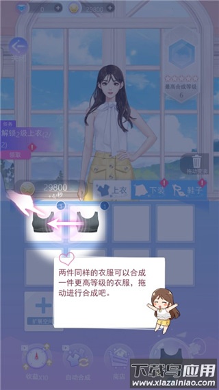 4、两件同样的衣服可以合成一件更高等级的衣服,拖动进行合成吧;达成任务目标,可以领取奖励;