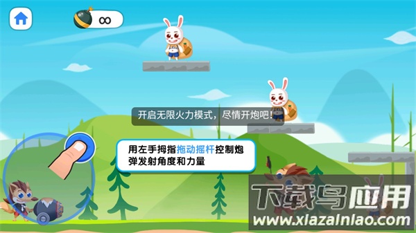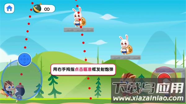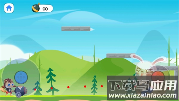 炸飞小兔兔是一款以狼兔对抗为主题的趣味射击游戏。玩家将扮演灰太狼,利用左手拖动摇杆调整炮弹发射的角度和力度,右手点击瞄准框即可发射炮弹,把藏在各处的小兔子全部炸飞即可顺利过关。
