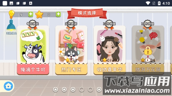 2、游戏提供多种热门模式选择,包括俺滴个牛吖、收纳嘉年华、脑洞万花筒等;