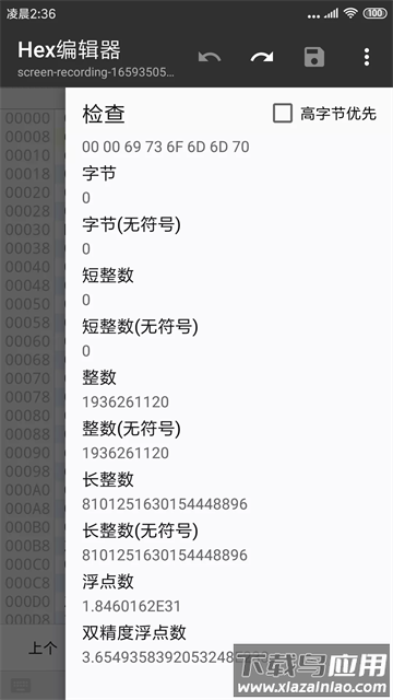3. 数据检查工具:侧滑调出检查面板,可解析光标处或选中区域的字节数据,转换为十进制或浮点数,支持高字节优先选项;
