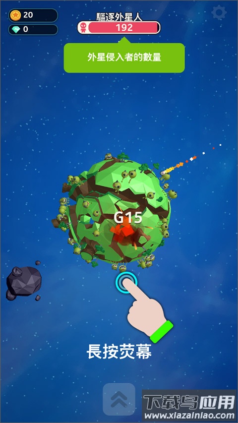 3、长按屏幕可以积蓄能量,释放强力大招一次性消灭大量外星敌人;