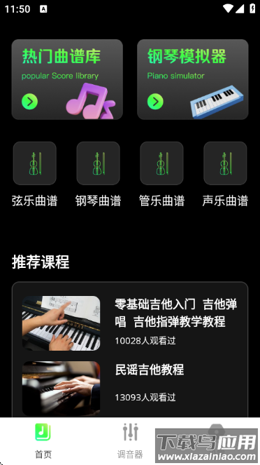 3、进入软件首页,界面展示热门曲谱推荐及主要功能入口;