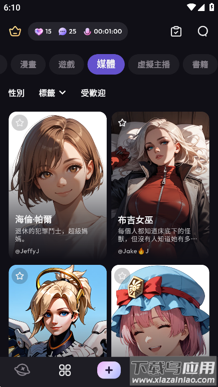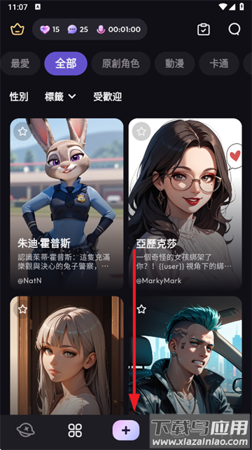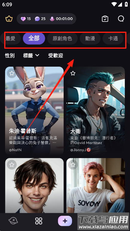 3、在主页可以看到众多AI角色,通过分类栏目可切换查看不同类型