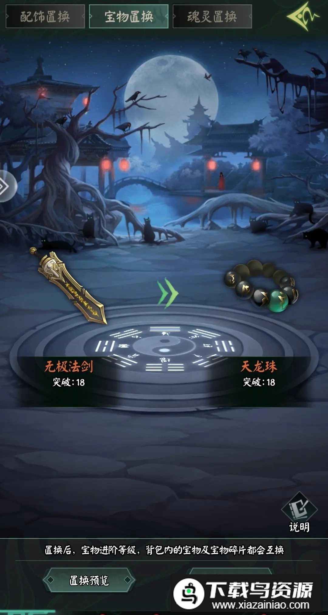 具体操作示例:现有18级无极剑法,云游即将掉落2个天龙珠;先将无极剑法与天龙珠置换,使天龙珠变为18级;领取奖励获得2个0级天龙珠;再次置换使无极剑法变回18级并额外获得2个碎片。此法同样适用于宝物商店,牢记“先置换后领取”要诀即可高效培养宝物。
