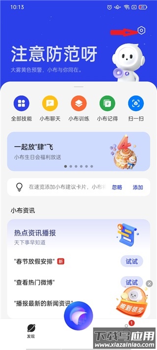 1、安装并打开小布助手,进入发现页面,点击右上角的设置图标;