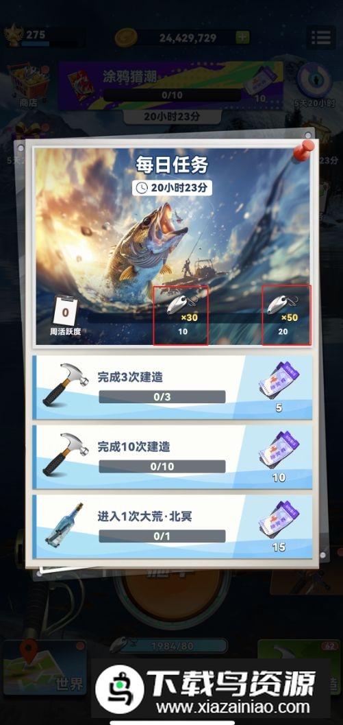 完成每日任务,累积周活跃度以获得更多的鱼钩